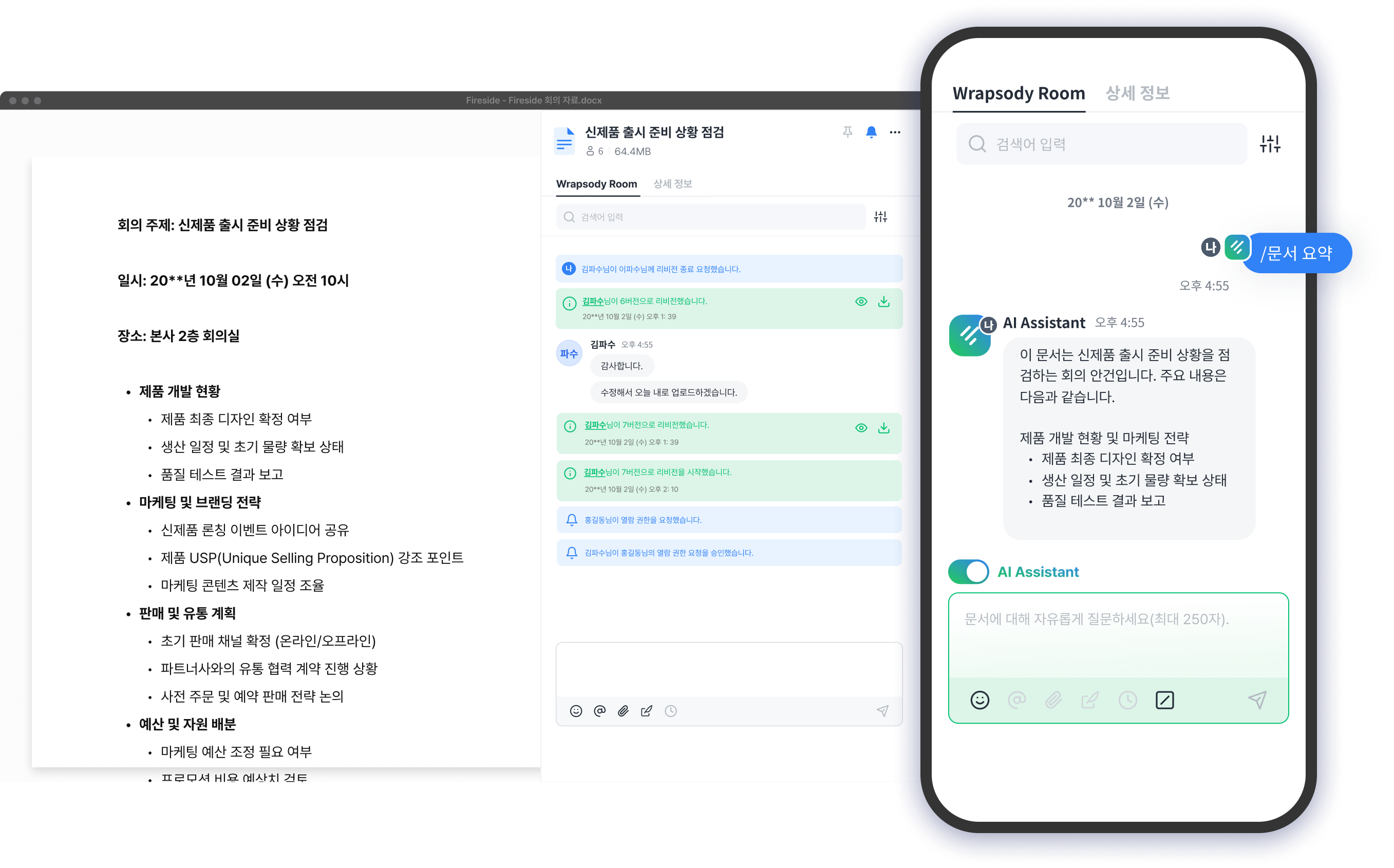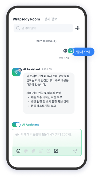 AI 기반 문서 중앙화 솔루션Wrapsody와 연동해 협업 데이터를암호화, 개별 콘텐츠 기반 채팅 및 AI Assistant를 제공합니다.